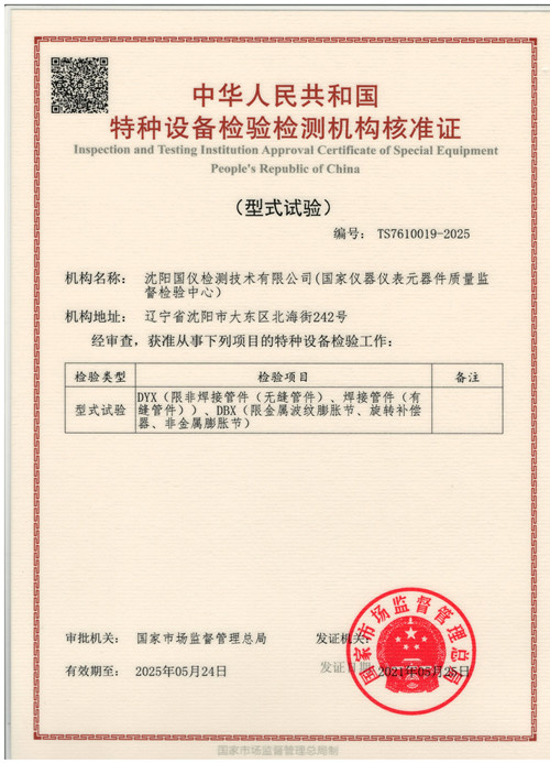 經國家市場監(jiān)督管理總局審查,獲準從事DYX(限非焊接管件(無縫管件)、焊接管件(有縫管件))、DBX(限金屬波紋膨脹節(jié)、旋轉補償器、非金屬膨脹節(jié))特種設備型式試驗檢驗工作。